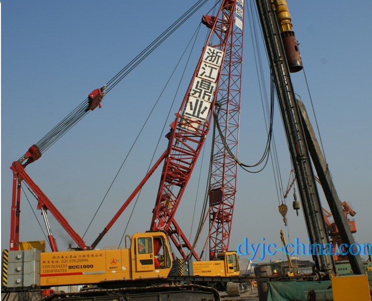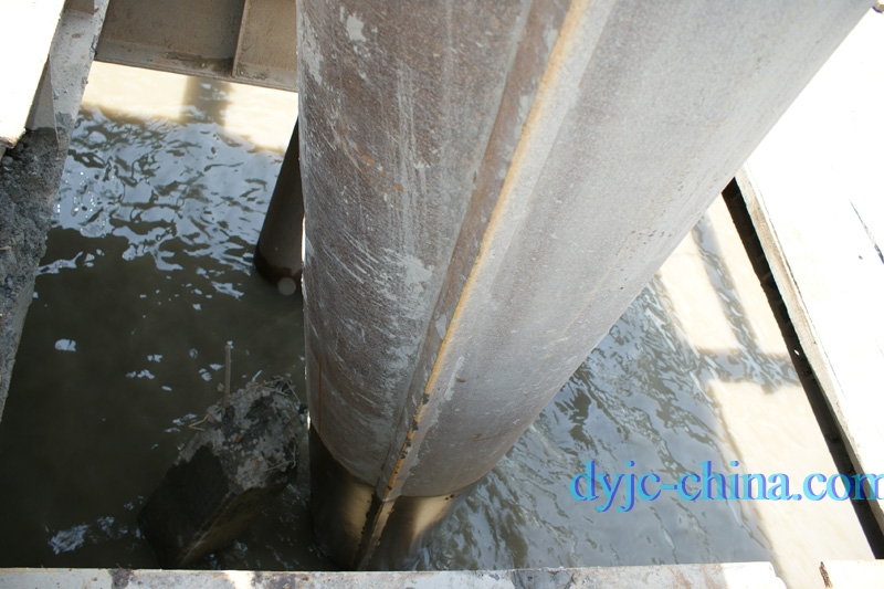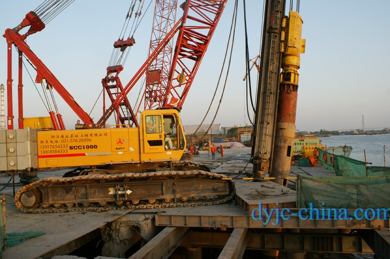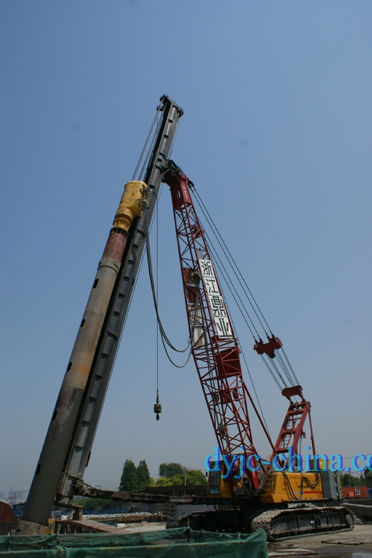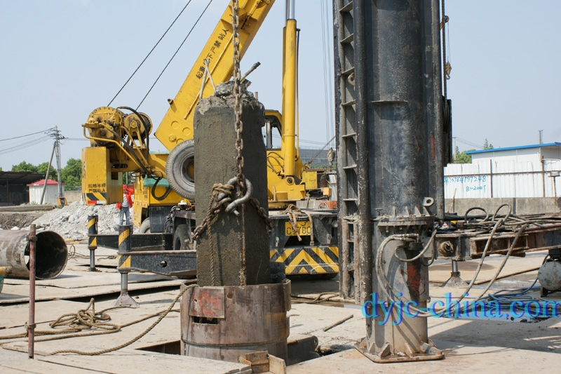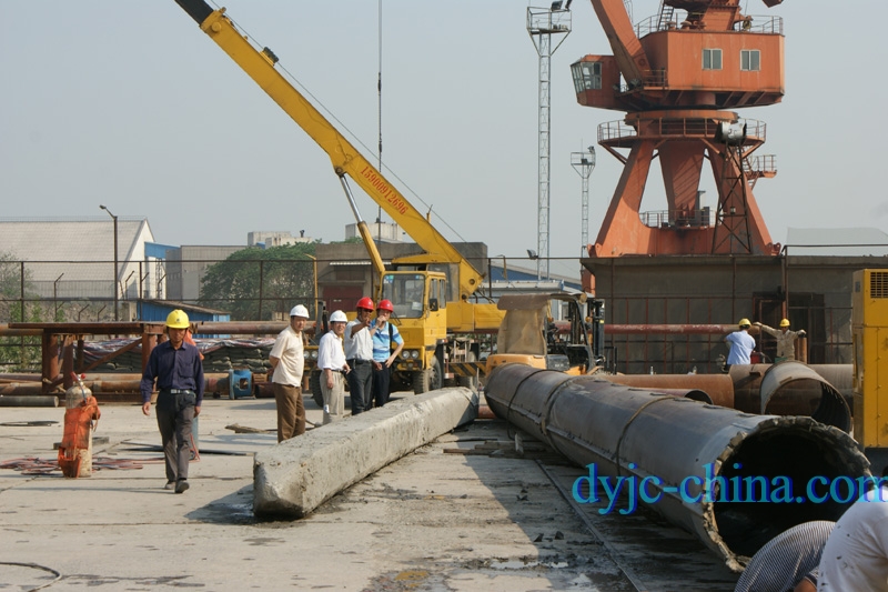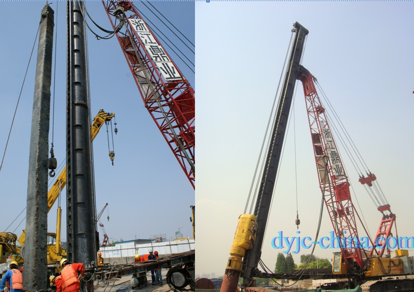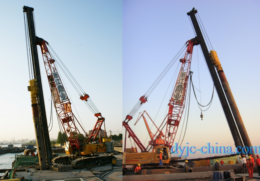 由于龍耀路越江隧道江中段盾構施工將穿越耀華皮爾金頓浮法玻璃碼頭樁群,盾構推進前需對影響盾構隧道施工的樁基進行拔除。根據相關資料,老碼頭外加寬泊位處的樁基為500×500mm預應力砼空心方樁,樁長36~38m,且存在部分斜樁。盾構頂標高-18.3m,需拔除62根樁,其中35根斜樁,27根直樁。舊樁侵入隧道約18m。由于本工程舊樁傾斜度相當大超過30度、且兩對交叉,特別是對于朝向黃浦江一側傾斜的舊樁,如果按照常理,必須搭設一個足夠寬的鋼平臺,作業(yè)面延伸到原碼頭外側數米,這樣不僅增加了工程量和危險性,并且大面積占用黃浦江,可能影響黃浦江通航,并且需要再次通過水務局評審手續(xù)。因此,常規(guī)方法根本無法完成本工程施工。因此,我司通過對專利清障施工設備(專利號:ZL 2007 2 0155651.3)FCEC全回轉正逆雙向同步快速旋轉切割的專利技術將其舊樁拔出清除,既克服了施工作業(yè)面的難題又實現(xiàn)了將傾斜度達30度的舊樁清除,保證了世博會重要隧道龍耀路越江隧道勝利貫通。