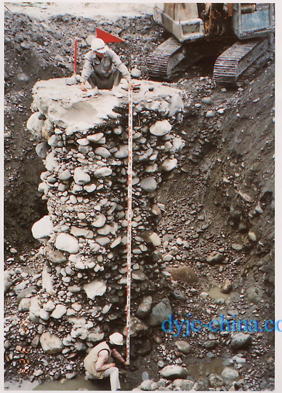 超級高壓噴射工法卵石層中高壓噴射成樁試挖。