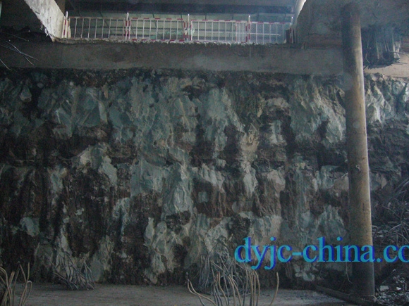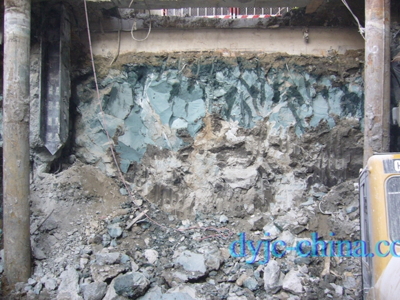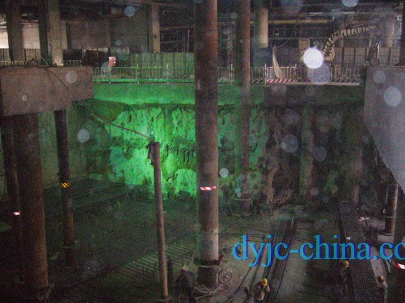 本工程為地鐵5號(hào)線文化中心站和6號(hào)線行政中心站的換乘通道,通道處于文化中心已建的地下空間下方,建筑面積約2900m2 。本方案施工的圍護(hù)、支撐部分,基坑圍護(hù)結(jié)構(gòu)采用超高壓旋噴工法樁,旋噴樁為φ1600、樁長(zhǎng)21m,內(nèi)插700×300H型鋼、型鋼長(zhǎng)15m。圍護(hù)樁頂采用1000×1600圈梁將樁頂與地下空間底板連接成整體。結(jié)構(gòu)柱托換采用靜壓鋼管樁+托換承臺(tái),鋼管樁直徑φ508及820mm、長(zhǎng)43.4m。