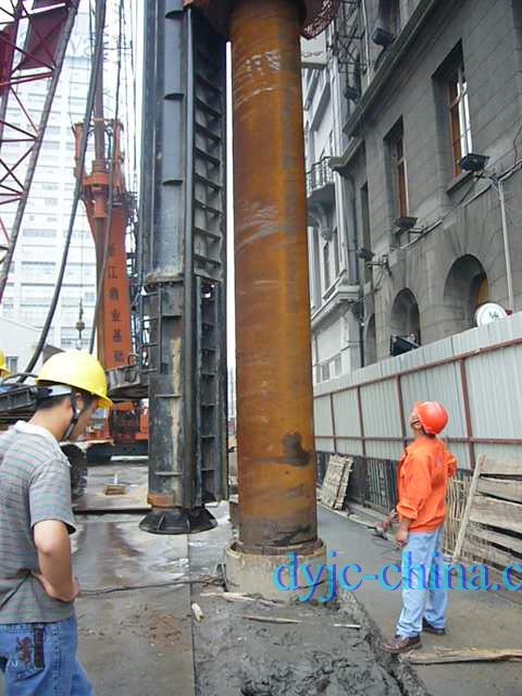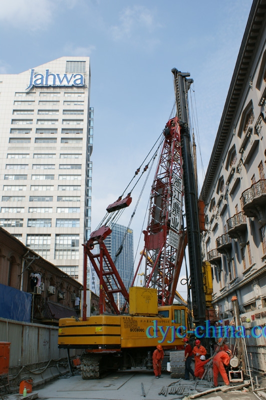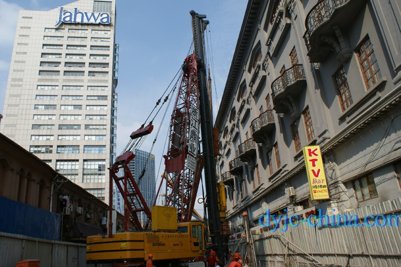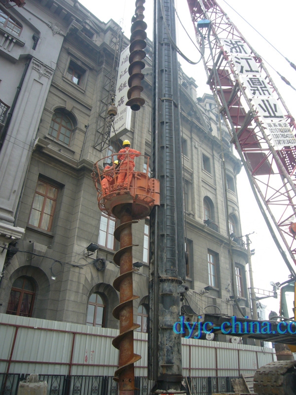 上海外灘通道綜合改造的重點工程從吳淞路閘橋天潼路地下隧道穿越浦江飯店和上海大廈蘇州河橋底下至福州路,距離隧道邊線到浦江飯店最近僅 1.7m,距上海大廈最小凈距 3.7m,這兩幢建筑均具有百余年歷史,為上海市保護性建筑,該老房子的基礎(chǔ)和樁基情況又較差,大部分無樁基礎(chǔ),在隧道盾構(gòu)穿越所造成沉降的影響下,建筑物的結(jié)構(gòu)安全很難保證,可能出現(xiàn)地基沉降、墻體開裂、建筑物傾斜破壞等問題,安全風(fēng)險非常大。因此必須進行一定的加固措施,主要措施為在隧道與浦江飯店基礎(chǔ)的間隙內(nèi)采用鉆孔灌注樁進行隔離,由于該工程不允許振動和太大的擾動,因此普通鉆孔灌注樁根本不允許施工,所以采用擾動最小的 FCEC工法來施工隔離樁,該工法采用正逆同步雙回轉(zhuǎn)全套管機械(專利號:200720155651.3),內(nèi)外同步正逆鉆至底標高,外鋼套管逆向旋轉(zhuǎn)、內(nèi)螺旋正向旋轉(zhuǎn)取出鋼管內(nèi)的土,外鋼套管護壁。而由于施工作業(yè)面狹小、地下管線錯綜復(fù)雜,并且要求成樁垂直精度高(1/400)、不得造成周邊建筑物沉降過大,施工難度相當大。