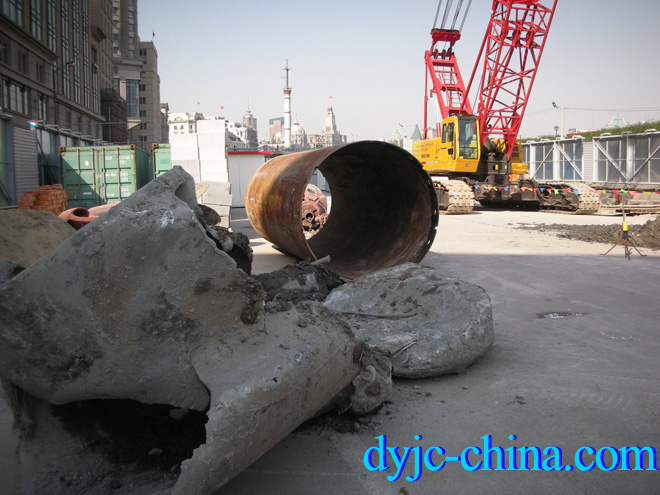 外灘通道是上海市“三縱三橫”交通主干網(wǎng)絡(luò)中三縱東線的組成部分,建造外灘地下通道的目的是緩解外灘地區(qū)的交通擁堵,分流三縱東線外灘的過境交通,改善外灘環(huán)境,提升城市功能,并服務(wù)上海世博會交通。因外灘通道改建工程圍護(hù)結(jié)構(gòu)施工,多處區(qū)域內(nèi)地下鋼筋混凝土結(jié)構(gòu)、塊石、舊樁等障礙物需要清除。清障施工必須克服地下管線錯綜復(fù)雜、周邊建筑物較多(大多數(shù)是上海市保護(hù)性建筑)而且緊靠構(gòu)筑物、施工場地狹小,且障礙物分布區(qū)域不詳。我公司采用360度全回轉(zhuǎn)套管鉆機(jī)、專利設(shè)備FCEC正逆雙向同步全回轉(zhuǎn)清障機(jī)(專利號:200720155651.3)進(jìn)行施工,對地下土體擾動小、清障徹底,保證了上海外灘通道改建整體工程的順利施工