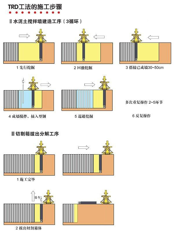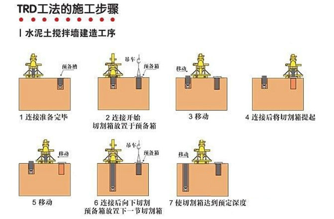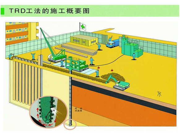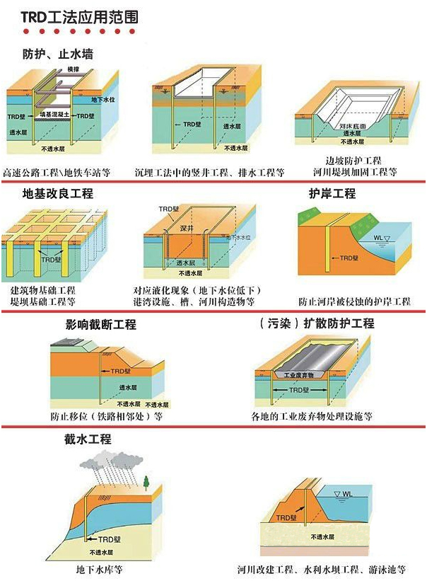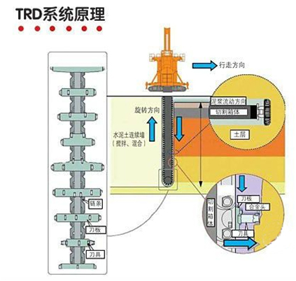 TRD工法(Trench cutting Re-mixing Deep wall method)渠式切割深層攪拌地下水泥土連續(xù)墻工法,一種在地面上垂直插入鏈鋸型刀端口連接刀鏈鋸,鏈鋸刀鉆(鏈?zhǔn)角邢髌?/span>)上下運(yùn)動(dòng)主機(jī)沿造墻方向水平移動(dòng),切剖出溝渠并注入固化液(水泥)使之和原位置的土混合,能在各類土層和砂礫石層中構(gòu)筑一道等厚的地下連續(xù)墻的一種施工方法。其主要特點(diǎn)是成墻連續(xù)、表面平整、厚度一致、墻體均勻性好。主要應(yīng)用在各類建筑工程、地下工程、護(hù)岸工程、大壩、堤防的基礎(chǔ)加固、防滲處理等方面。