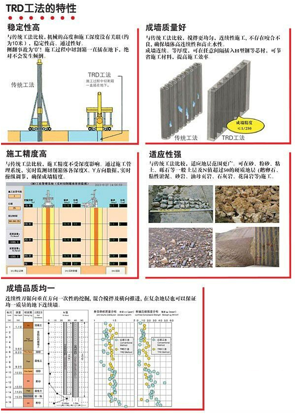 與傳統(tǒng)工法比較,攪拌更均勻,連續(xù)性施工, 不存在咬合不良, 確保墻體高連續(xù)性和高止水性。成墻連續(xù)、等厚度,是真正意義上的“墻”??稍谌我忾g隔插入H型鋼等芯材,可節(jié)省施工材料,提高施工效率。