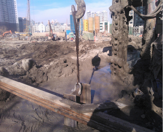 TRD深層攪拌墻為基坑止水帷幕,寬度800mm,深度為47.80m,共計約100延長米;其中TRD深層攪拌墻需從基坑內(nèi)向外穿過已完成支護(hù)樁(間距1000mm,中間插入型鋼代替支護(hù)樁),從而包圍塔樓形成塔樓部分局部加深基坑的止水帷幕,施工精度要求較高。